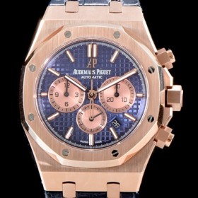 • 레플리카 [오데마피게] 남성용 "New 41mm사이즈 가죽밴드 UP!!"로얄오크 26331OR.OO.D315CR.01 크로노그래프 고급스러운 18K 로즈골드 케이스 네이비 와플 다이얼 신형 ETA 7750B-2 오토매틱 무브먼트 AUD0101