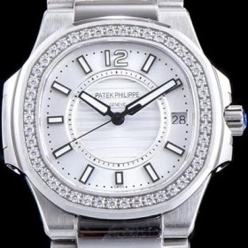 레플리카 [파텍필립] 여성용 노틸러스 7011/1G-001 하이엔드 최상급쥬얼 다이아몬드 베젤 화이트 텍스쳐 다이얼 브레이슬릿 스위스 정품 쿼츠 무브먼트 PAT0110
