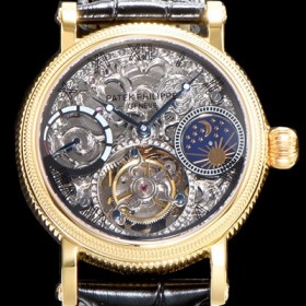 • 레플리카 [파텍필립] 남성용 그렌드 컴플리케이션 18k 옐로골드 문페이즈 세귤 리얼 투어빌론 최상급 쥬얼 다이아몬드 베젤 스켈레톤 다이얼 PAT0400