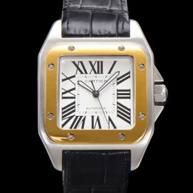 Cartier Santos 100 Automatic ETA2824-2 Type 18k Yellow Gold Bezel Men's 51mm Leather Strap White Dial