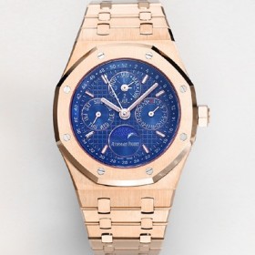 레플리카 [오데마피게] 남성용 로얄오크 26574 퍼페츄얼 캘린더 문페이즈 18K 로즈골드 41mm 블루 다이얼 신형 5134 오토매틱 무브먼트 aud4212