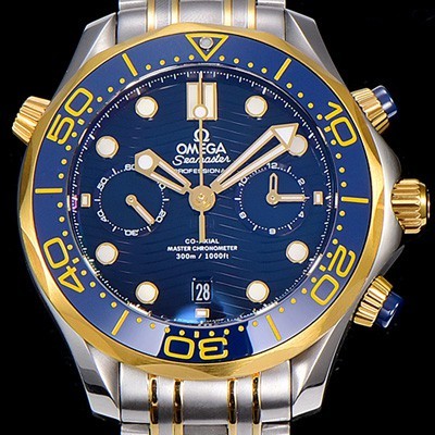 • 레플리카 [오메가]남성용 씨마스터 다이버 300M 마스터 크로노그래프 옐루골드 44mm 블루다이얼 OMG53678