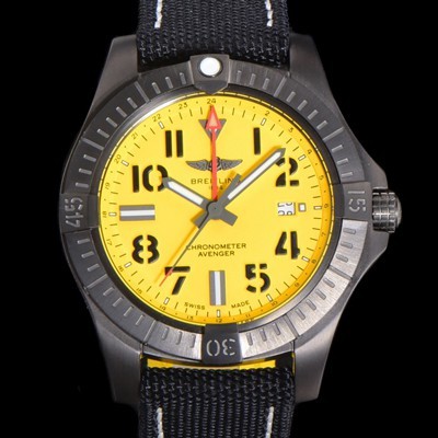 레플리카 [브라이틀링] 남성용 어벤져 나이트 미션 밀리터리 한정판 오토매틱 ETA2836-2 타입 GMT 45mm DLC코팅 무광 올블랙 나토천/가죽 믹스 옐루다이얼 bre74988 요약정보 및 구매