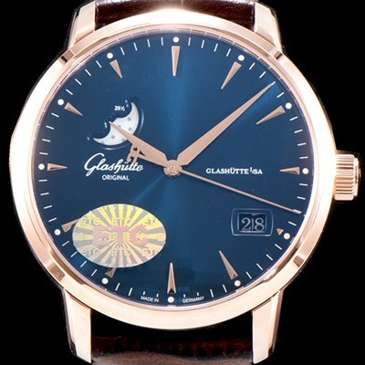 • 레플리카 [글라슈테 오리지날] 남성용 세나토 "고급스러운 18K 로즈골드 아플리케 인덱스" UP!! 1-36-04-05-02-02 "엑설런스 파노라마 데이트&문페이즈" 네이비 다이얼 오토매틱 무브먼트 GLA4202