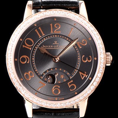 • 레플리카 [예거르꿀르뜨] 남성용 랑데부 나잇&데이 3442150 레이디 워치 18K 로즈골드 최상급 다이아몬드 세팅 베젤 문페이즈 그레이 다이얼 오토매틱 무브먼트 JAG0423