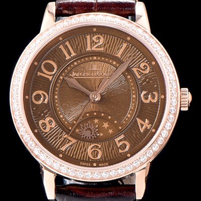 레플리카 [예거르꿀르뜨] 남성용 랑데부 나잇&데이 344242J 레이디 워치 18K 로즈골드 최상급 다이아몬드 세팅 베젤 문페이즈 브라운 텍스쳐드 다이얼 오토매틱 무브먼트 JAG0420