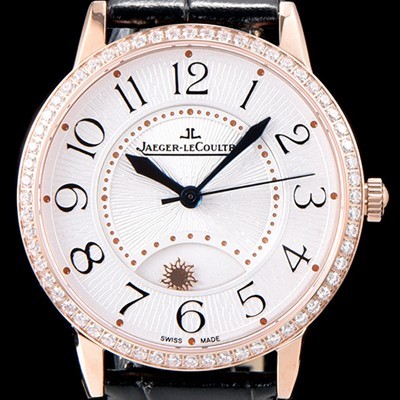 • 레플리카 [예거르꿀르뜨] 남성용 랑데부 나잇&데이 3442440 레이디 워치 18K 로즈골드 최상급 다이아몬드 세팅 베젤 문페이즈 화이트 텍스쳐드 다이얼 오토매틱 무브먼트 JAG0424