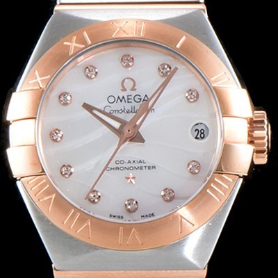 • 레플리카 [오메가] 남성용 여성 컬렉션 컨스틀레이션 123.20.27.20.55.003 오메가 코-액시얼 27MM 로마 숫자가 인그레이빙된 베젤 18K 로즈골드 콤비 화이트 자개 다이얼 쿼츠 무브먼트 OMG4110