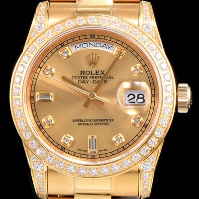 레플리카 [로렉스] 남성용 오이스터 퍼페츄얼 118348 데이데이트 최상급쥬얼 다이아몬드 세팅 18K 옐로우 골드 브레이슬릿 오토매틱 무브먼트 ROL0300