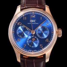 아이더블유씨 포르투기즈 퍼페추얼 캘린더 문페이즈 오토매틱 42mm Cal.82650 타입 18K 로즈골드 남성용 가죽줄 블루다이얼  iwc045430421