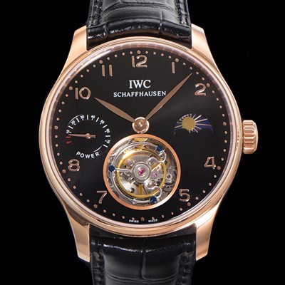 • 레플리카 [아이더블유씨] 남성용 신제품 UP!! 포르투기즈 컴플리케이션 하이  "투어빌론 문페이즈 파워 리저브"아시안 투어빌론 탑재  18K 로즈골드 42mm 가죽줄 블랙 다이얼   iwc1959