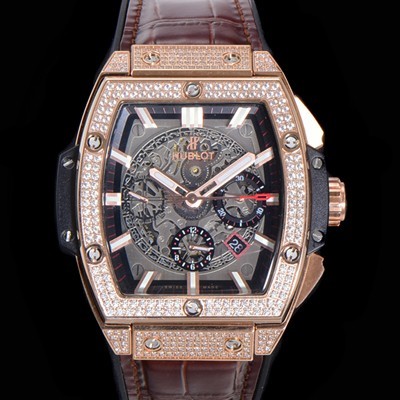 • 레플리카 [휴블렛] 남성용 스피릿 빅뱅 마스터피스 크로노그래프 Hub4700타입 45mm 18K로즈골드/다이아몬드 셋팅 가죽줄 스켈래톤다이얼 hub2191