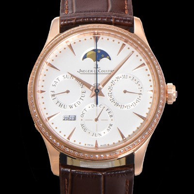 • 레플리카 [예거르꿀뜨르] 남성용 마스터 울트라 퍼페추얼 캘린더 18K 로즈골드 오토매틱 MC868 타입 39mm 가죽줄 다이아몬드베젤 문페이즈 화이트 다이얼 jag80287