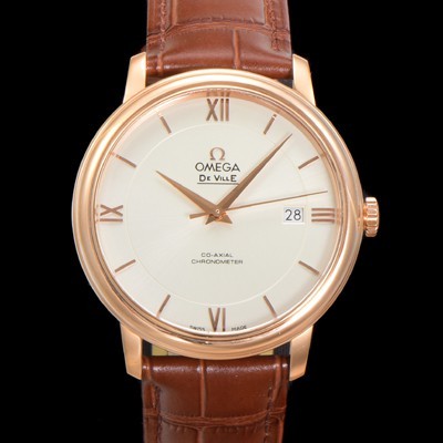 Omega Men's De Ville Prestige Automatic Cal.2500 Type 39.5mm 18K Rose Gold Leather Strap White Dial