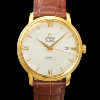 Omega Men's De Ville Prestige Automatic Cal.2500 Type 39.5mm 18K yellow gold Leather Strap White Dial
